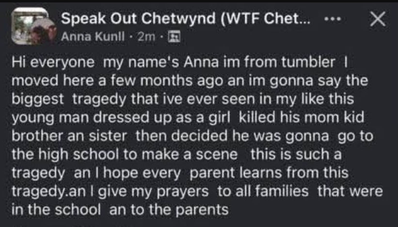 The media is DESPERATE to shield the fact that “the female in a skirt” is a man from you as it goes against the narrative that these people are “victims when in fact this is just ANOTHER instance of these severely mentally ill men indulging in mass killings.Is it wise to indulge their mental illness? Would it not be better to give them treatment, make sure they are not taking drugs/hormones and keep people safe from them?