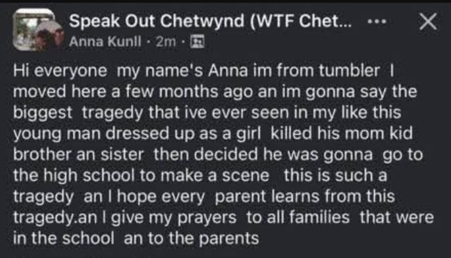 It appears that the alleged mass killer is a biological male – I won’t report his name or show his images but these are widely known. It seems that he started to “‘identify” as female a few years ago. It is further suggested he may have killed his own family before going to the school. Quite horrific all round.