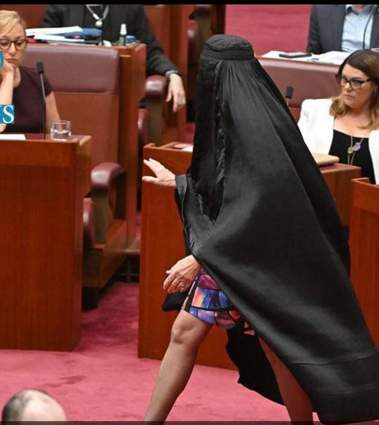 When her bill proposing a total ban on the burqa was predictably rejected by the cowards in the Senate, Hanson then chose to wear it in parliament. (Nice legs, btw) This demonstrated the issue visually, stating that if the parliament will not ban it, she will display the garment publicly so “every Australian knows what’s at stake”.