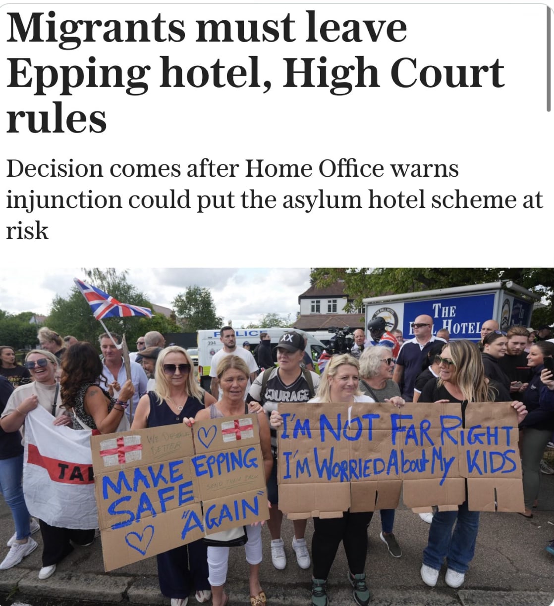 Well this one was a welcome surprise for British patriots and a worrisome defeat for Yvette Cooper’s Home Office! A significant High Court ruling handed down by Mr Justice Eyre grants Epping Forest District Council a temporary injunction against the Bell Hotels owners, Somani Hotels Ltd, requiring all asylum seekers to vacate the premises by September 12. Get them out!