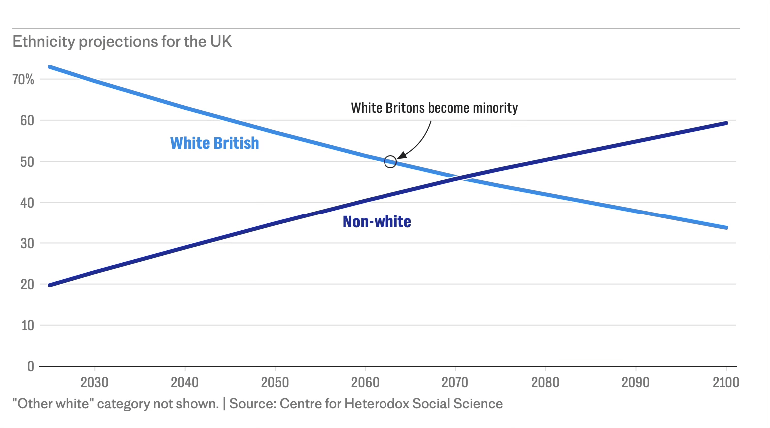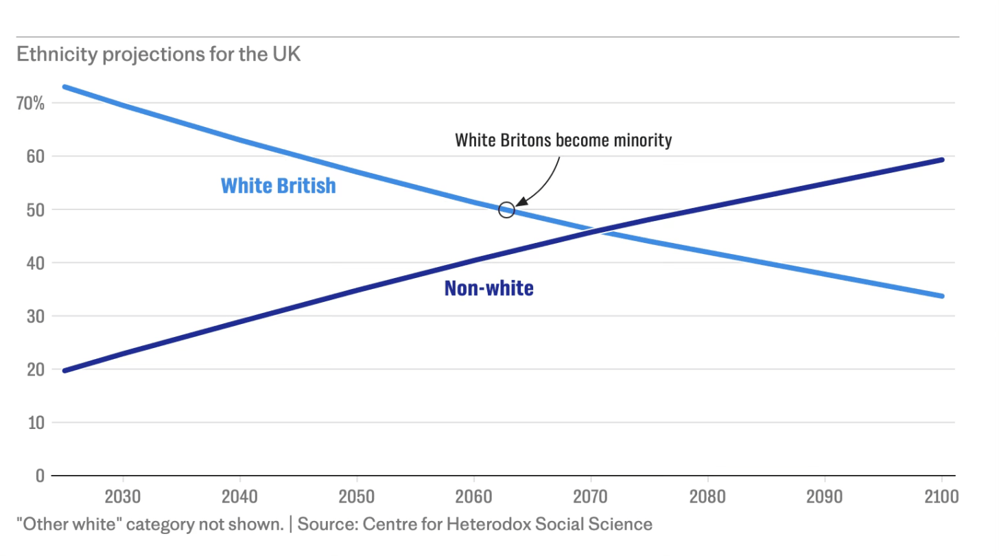 What is a country? It is obviously a geographical area of land with defined borders. But it is more than that, MUCH more than that. It is the people who live in that country and in the case of England, it is the sum of the English people who have inhabited that land for many centuries. Throughout most of that period, the demographic has been pretty stable. The typical demography in 1960 was around 98% White British. But since then that has been changing, slowly at first, then faster and faster and we have now arrived at the reality where our London is about to become a minority White City.