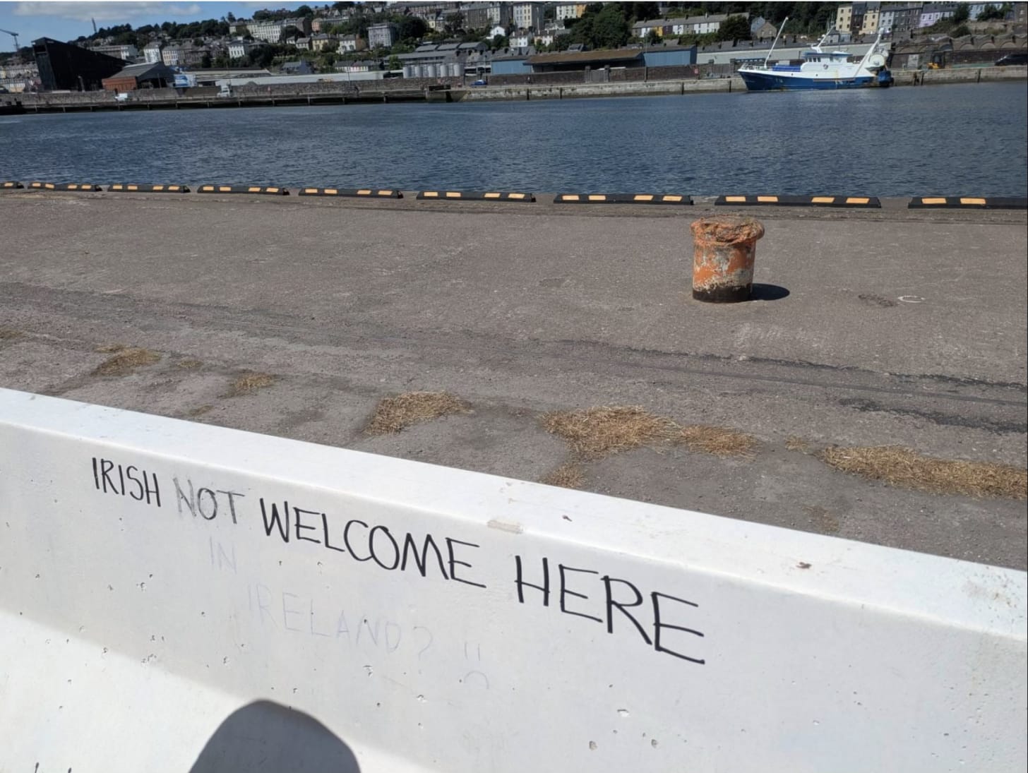This image was recently captured on the quays in Cork City and it sums up what is happening in Ireland in 2025. Migrants have arrived in large numbers and tend to gather in localised areas where they can become confident and exercise territorial control. That’s the case in parts of Cork city. And what is one of the first actions of these migrants? Well, it’s not to express their thanks and gratitude. It’s to tell the Irish that they are not welcome in these areas. Get out. No Irish here.