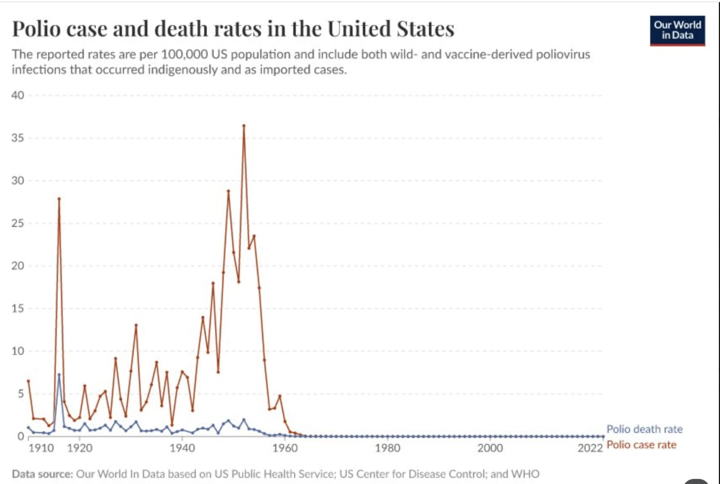 In 1960, US children received vaccines against five diseases as part of the routine childhood immunisation schedule. These included diphtheria, tetanus, pertussis polio, and smallpox. I don’t even think any of those were necessary and it’s worth looking at the chart concerning polio for starters,