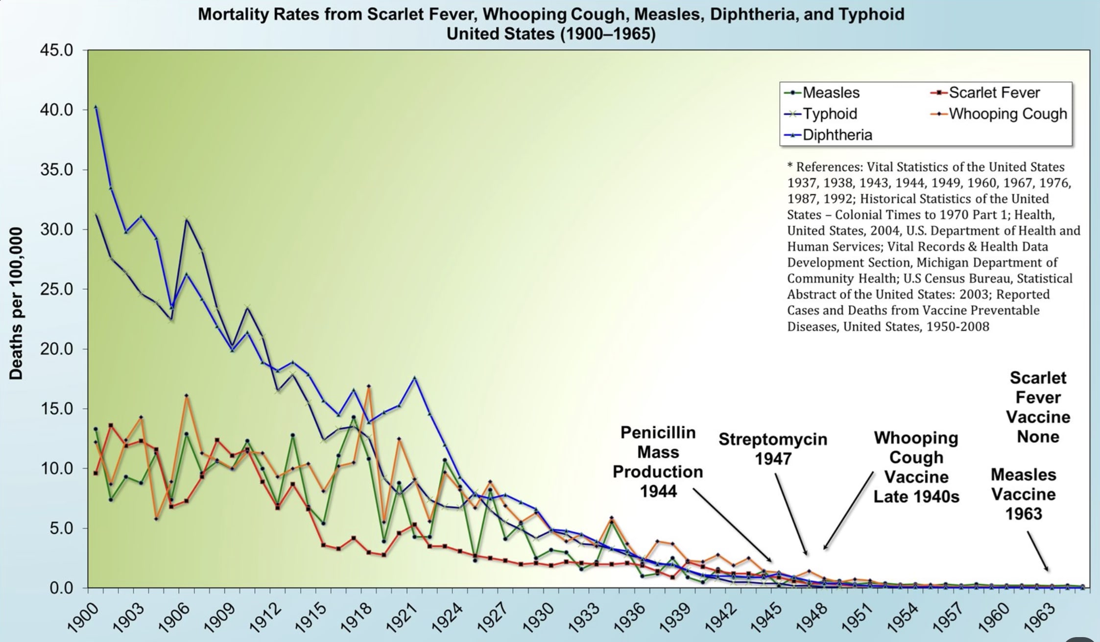 Improvements in hygiene, sanitary conditions, nutrition and environmental factors did more to eradicate these conditions than anything that ever came out of a vaccine needle.