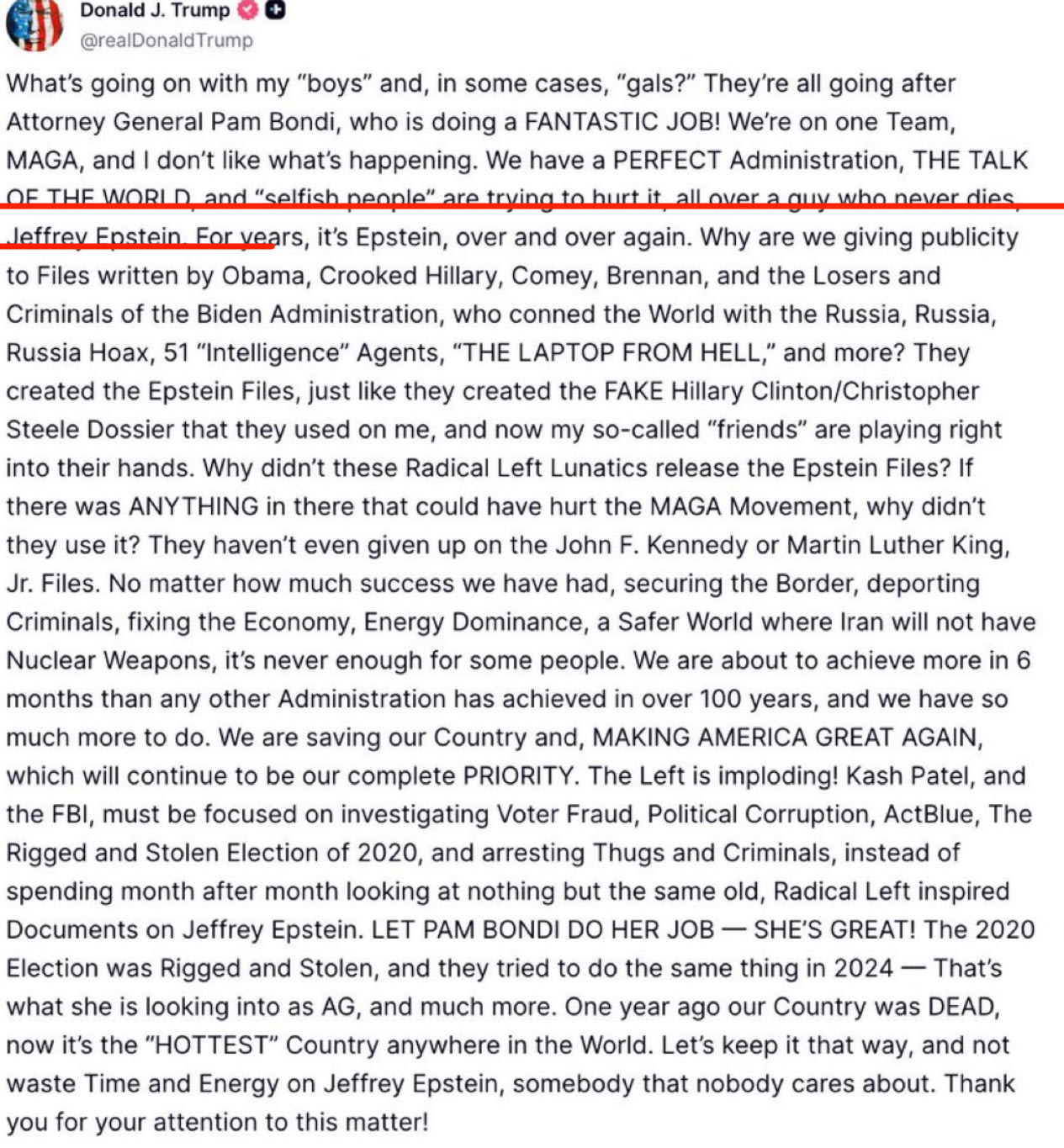 Epstein’s survival makes sense: a man of his cunning, with dirt on the world’s most powerful, wouldn’t be allowed to die so conveniently. He just slipped away. That’s why Trump doesn’t want us to discuss it!
