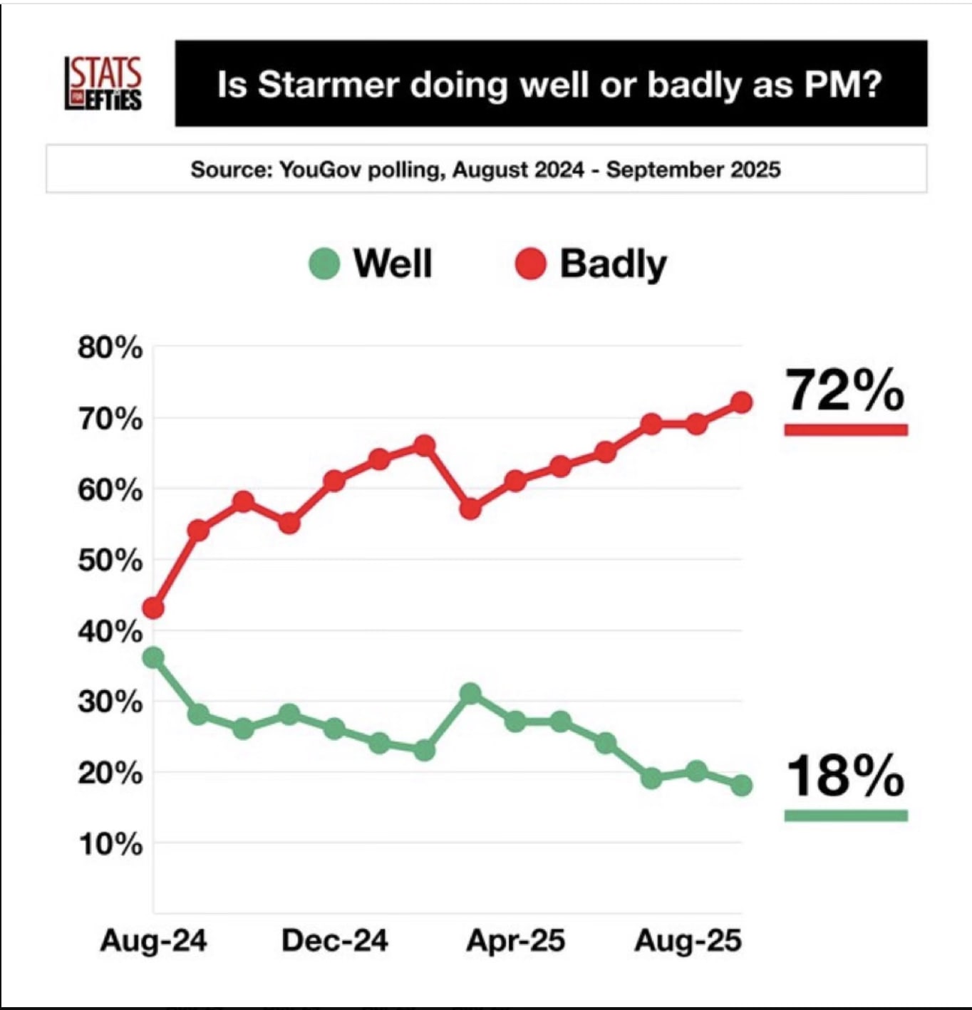 He started badly and then it got worse. No other Prime Minister has become so unpopular so quickly. This is a very unusual and I don’t think that swapping Starmer for another can fix it. The economy is going down the tubes, our streets aren’t safe for even dog walkers, the border is wide open and fixing this requires competence. Labour does not have this resource so my forecast is that, if anything, Labour will keep declining. I see no way back for Labour at this point.