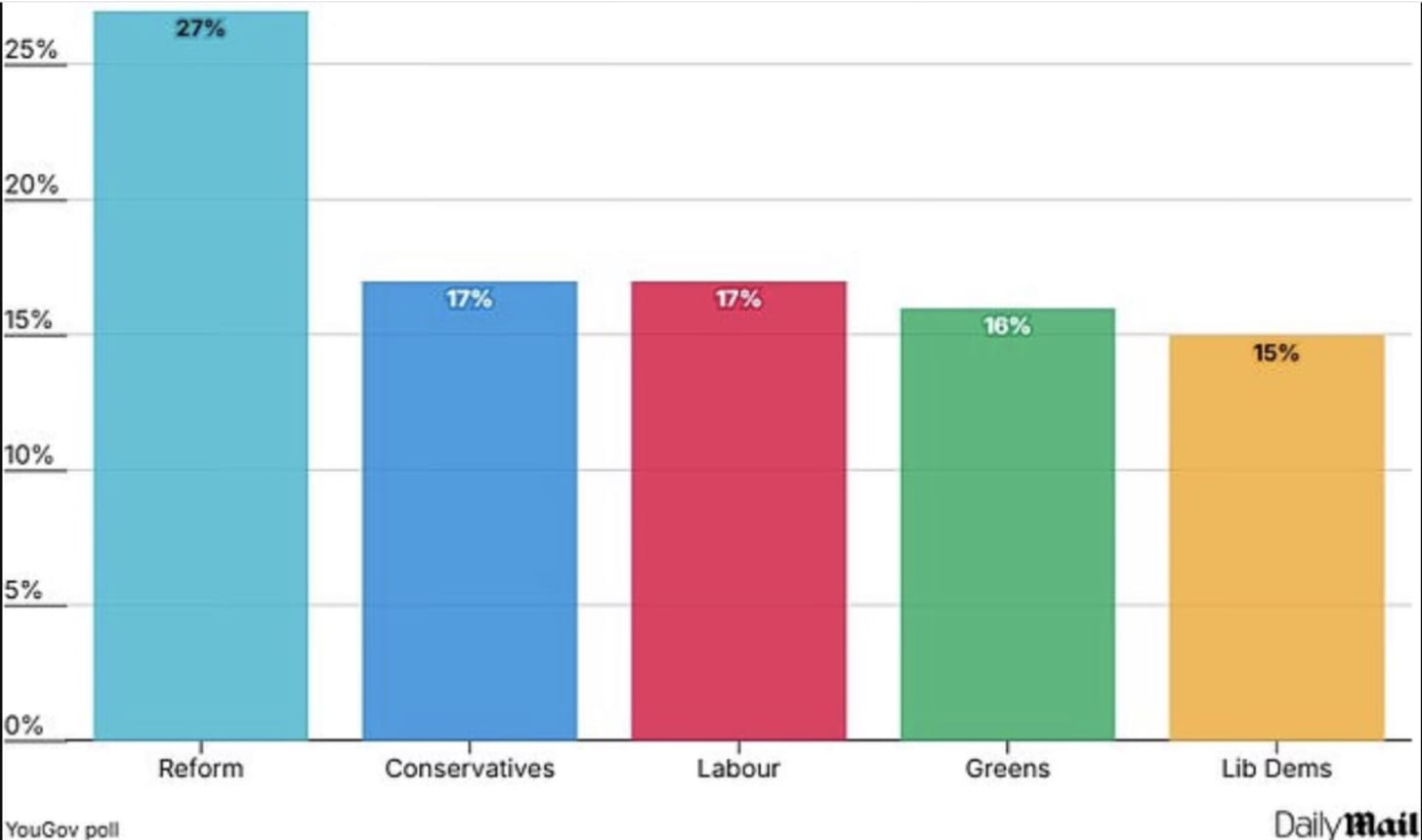 Labour sit humbled on 17%, the lowest recorded share of the vote in its history. It is only 1% ahead of the rabid loons in the Greens and on par with the dying Conservatives. Reform has increased its lead to 10% which is respectable.