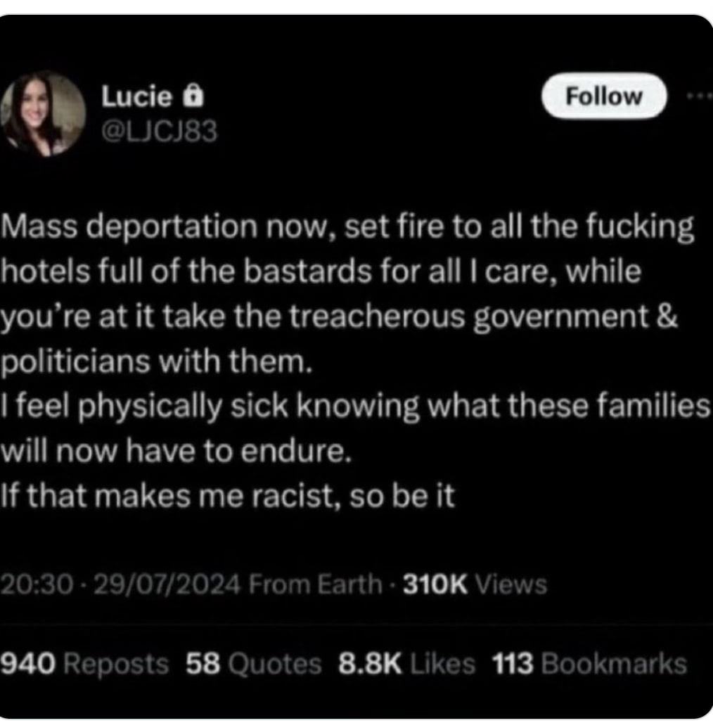 I am sure most readers will share in the sense of relief that Lucy Connolly has been released from prison early. Her crime, as you may recall, was to post a hurty tweet. This is what was used to send her to jail.