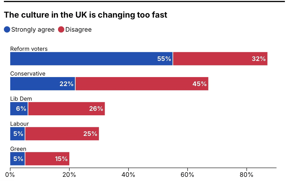 On the issue of tensions between immigrants and native Brits, we also see massive change. 86% of people sense tension up from 74%. Almost half of people think cultural shifts are going “too fast” This sentiment is across race demographics: white Britons from 35% to 52%, ethnic minorities a steadier but rising 35%. So this is not a RACE thing, it is a culture thing! Calling us “racist” for pointing out issues that some minorities are also concerned about doesn’t work anymore. However, as you can see, the parties on the Left aren’t that bother. Why would they be? They seek to destroy what we have.