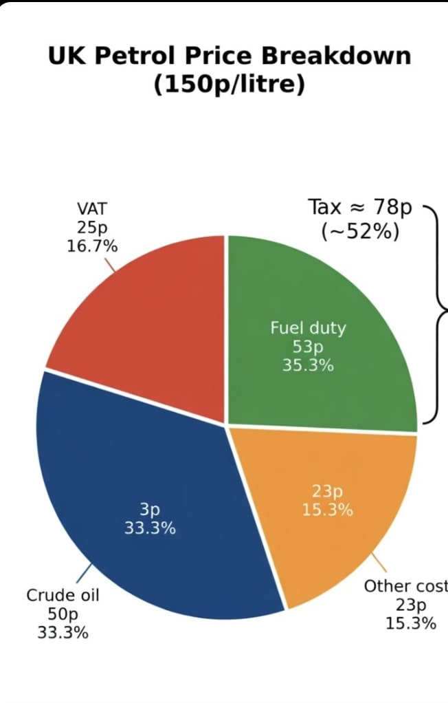 The Exchequer takes a FIXED 53p Fuel Duty per litre and then on top of that takes VAT currently around worth 25p per litre. So the more base petrol/diesel prices rise, the more the Chancellor benefits. She is the price gouger.