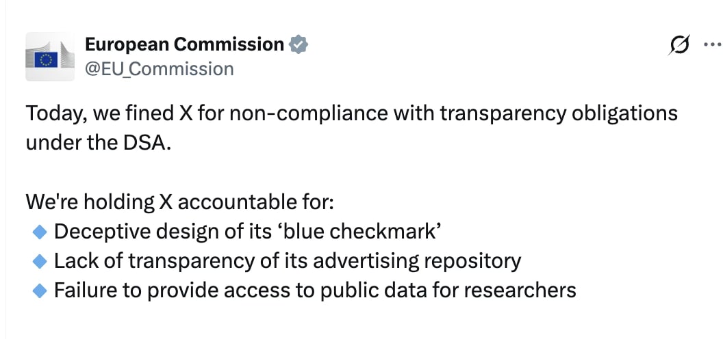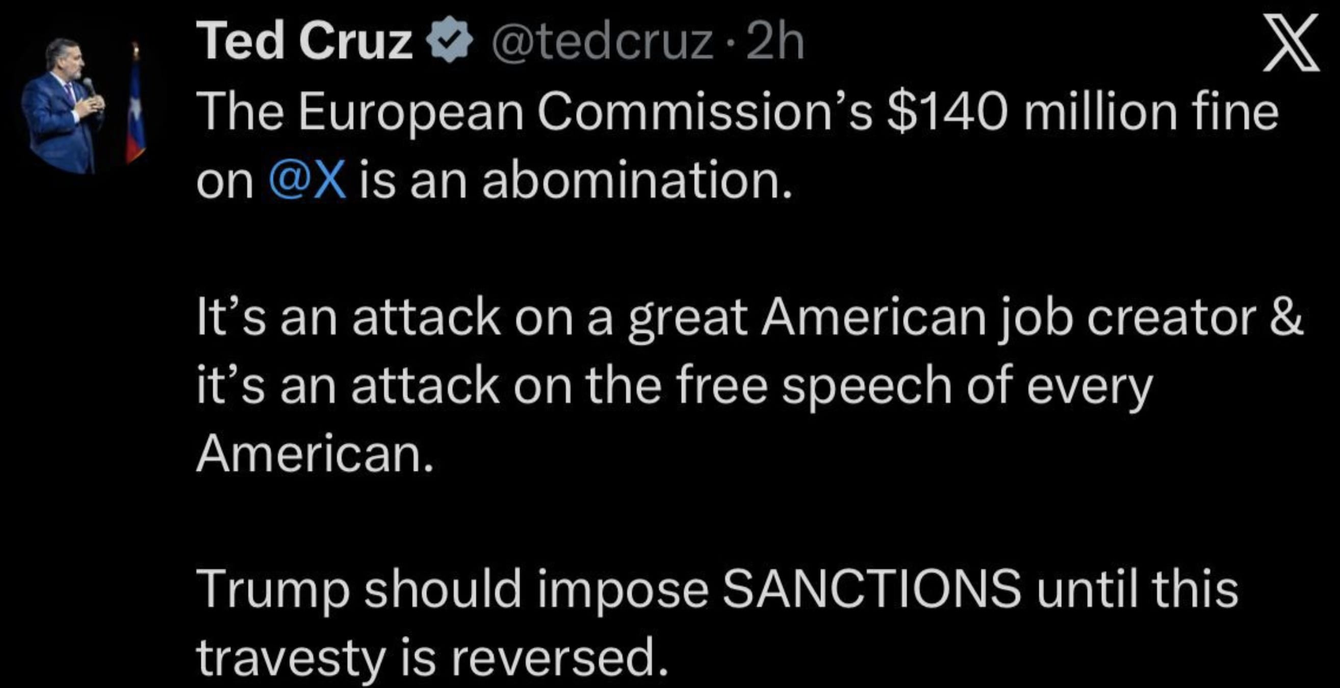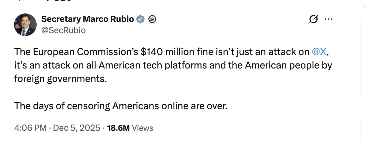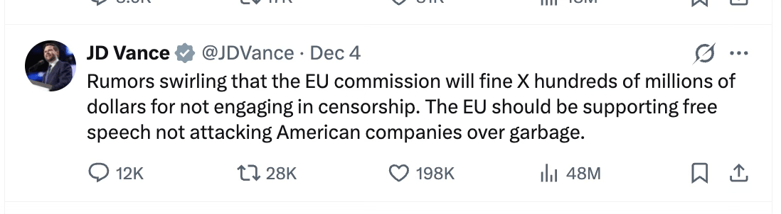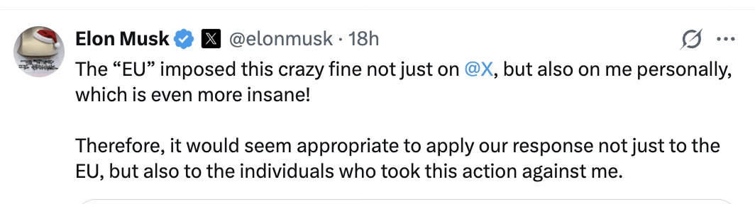 There are several things that the United States COULD and SHOULD do in response to this financial assault on the free speech provided by Musk on X. The best way to punish the EU is to to double the EU fine and all the individuals involved (EU officials) should be personally barred from entering USA for 10 years. Restrict EU access to US business.