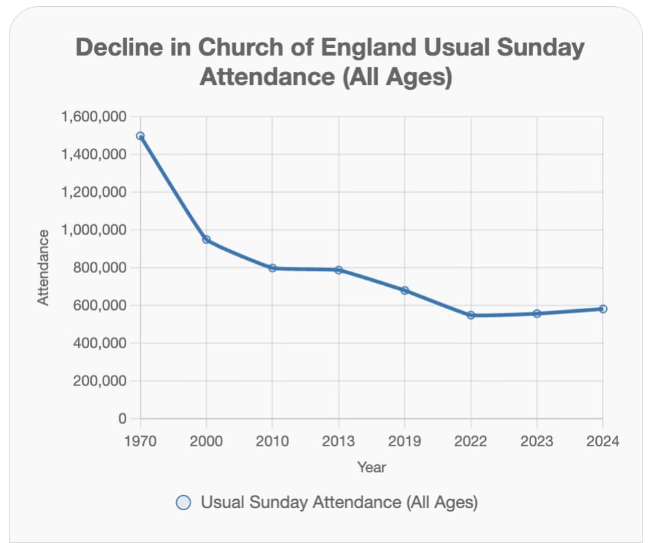 The Church of England is dying and that’s been the case for some years. Membership has fallen by from around 1.5 million in 1970 to approximately 582,000 in 2024. By the end of this century it is likely be all but extinct. I suppose it had a good run, founded in 1534 and it got as far as 2025.