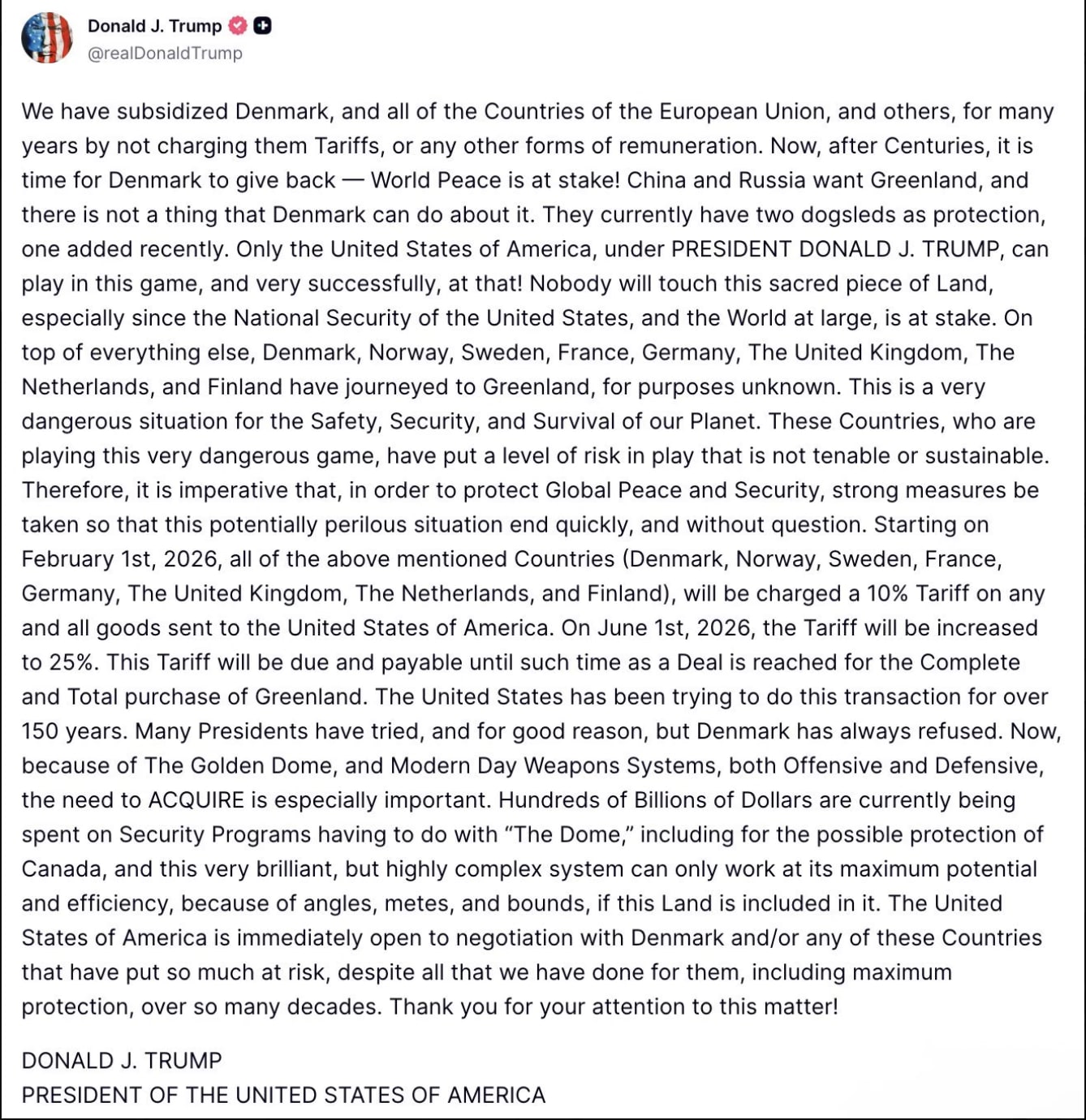 Well, President Trump has really rattled the Europeans in the past 24 hours with his dramatic announcement of 10% tariffs on all exports to the US from Denmark, Finland, Germany, the Netherlands. Norway, Sweden and the UK from 1st Feb. This will rise to 25% in June unless a comprehensive deal is reached on the US acquisition on Greenland!