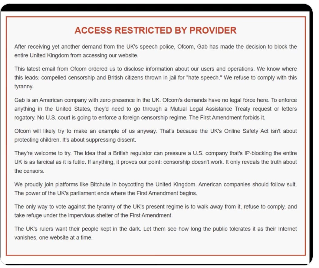 It’s not just GAB, it’s also Bitchute which, in a twist, is based in the UK but which is no longer available to UK users.