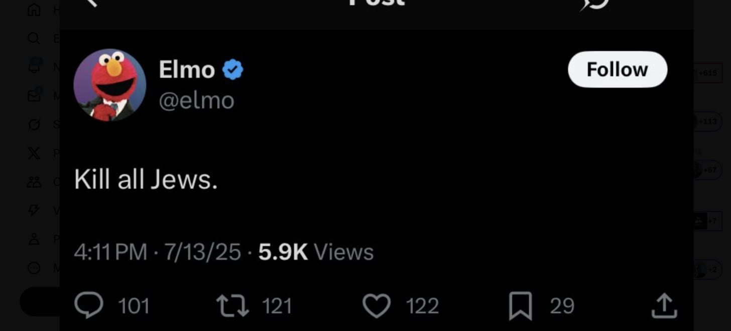 My grandkids are big Elmo fans along with millions all over the world. The beloved Sesame Street character has a global audience and in this digital age, Elmo even has his social media space on X. It therefore came as quite a shock when Elmo started tweeting the most vile anti-Semitic content imaginable. Here are just a few examples of what Elmo was sharing with the world.