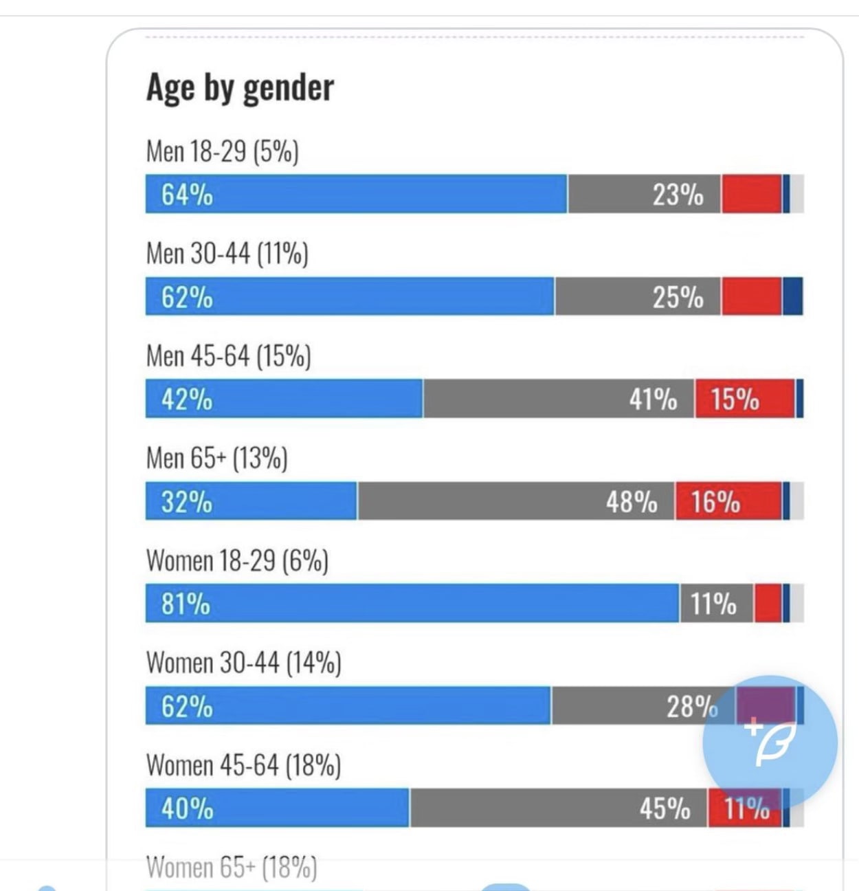 The Blue bar is Mamdani support and as you can see , young women aged 18-29 disproportionately voted for him – 81%.