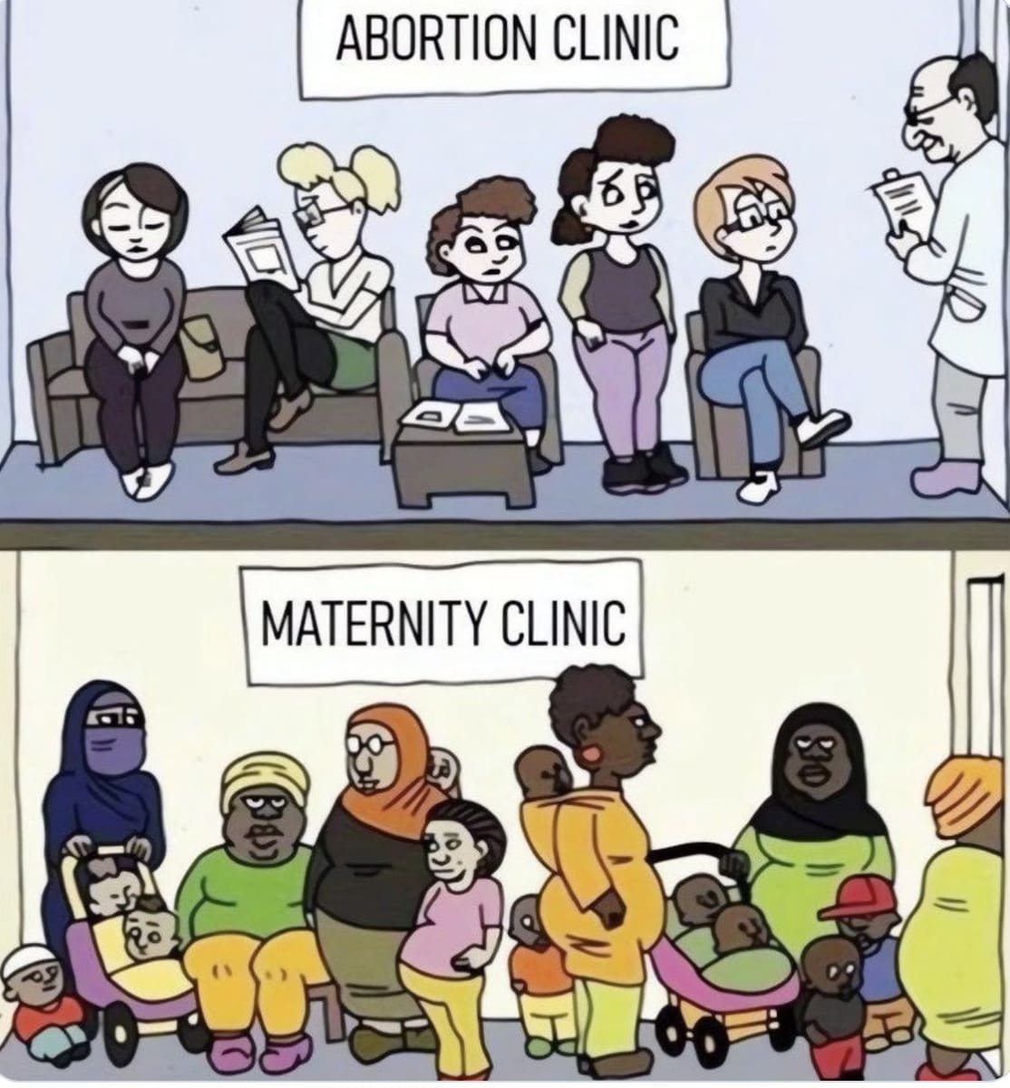 Sometimes a cartoon is worth a thousand words and so it is with this because it sums up all that is wrong with our western societies. White liberal women prefer to abort their babies and ethnic migrants can’t have enough of them. If you believe demography is destiny, we’re f*cked and not in a good way.